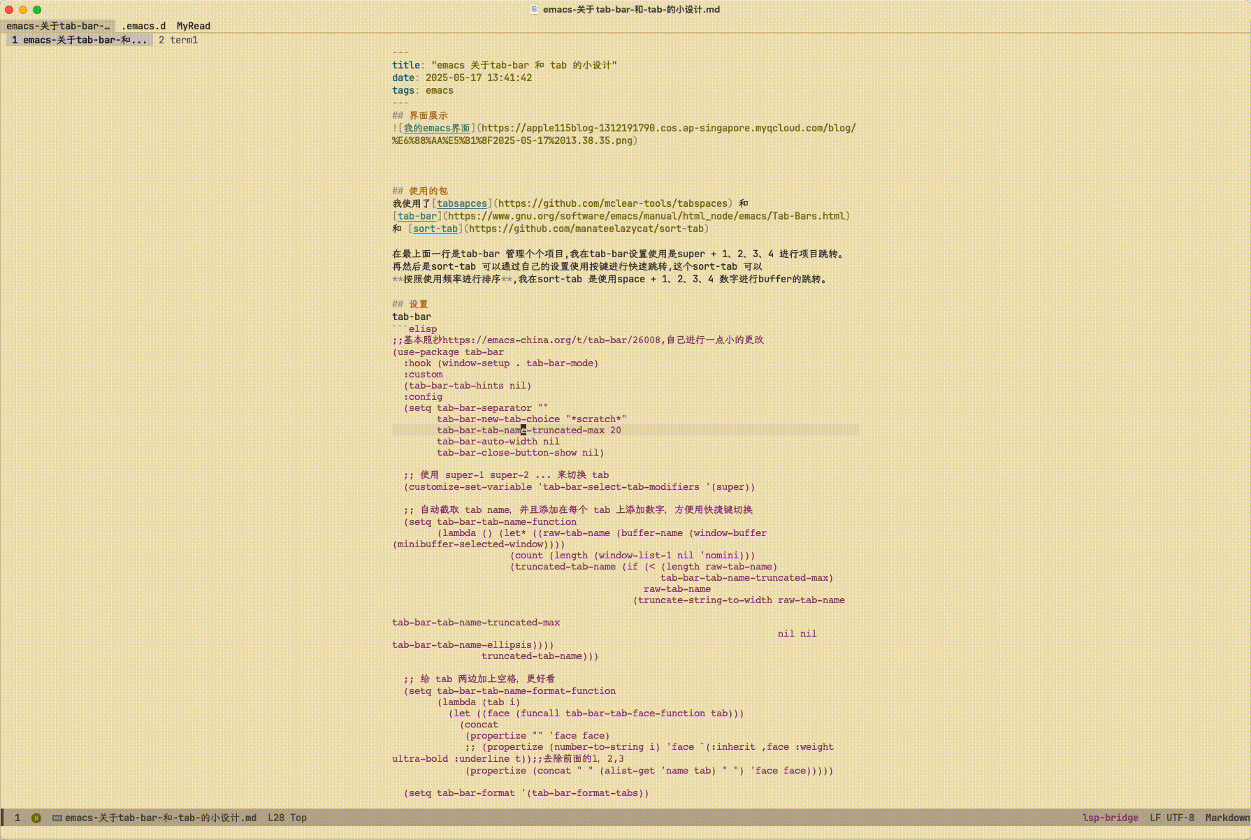 (use-package tabspaces :ensure t :hook (after-init . tabspaces-mode) ;; use this only if you want the minor-mode loaded at startup. :commands (tabspaces-switch-or-create-workspace tabspaces-open-or-create-project-and-workspace) :general (:keymaps 'override :states '(normal visual) :prefix "SPC" "p" '(:ignore t :wk "project") "p p" '(tabspaces-open-or-create-project-and-workspace :wk "find project") "p q" '(tabspaces-kill-buffers-close-workspace :wk"kill project buffer") "p s" '(tabspaces-save-current-project-session :wk"save project sessions") "p r" '(tabspaces-restore-session :wk"restore project sessions") ) :custom (tabspaces-use-filtered-buffers-as-default t) (tabspaces-default-tab "Default") (tabspaces-remove-to-default t) (tabspaces-include-buffers '("*scratch*")) (tabspaces-initialize-project-with-todo nil) ;; (tabspaces-todo-file-name "project-todo.org") ;; sessions ;; (tabspaces-session t) ;; (tabspaces-session-auto-restore t) (tab-bar-new-tab-choice "*scratch*")) :config (with-eval-after-load 'consult ;; hide full buffer list (still available with "b" prefix) (consult-customize consult--source-buffer :hidden t :default nil)